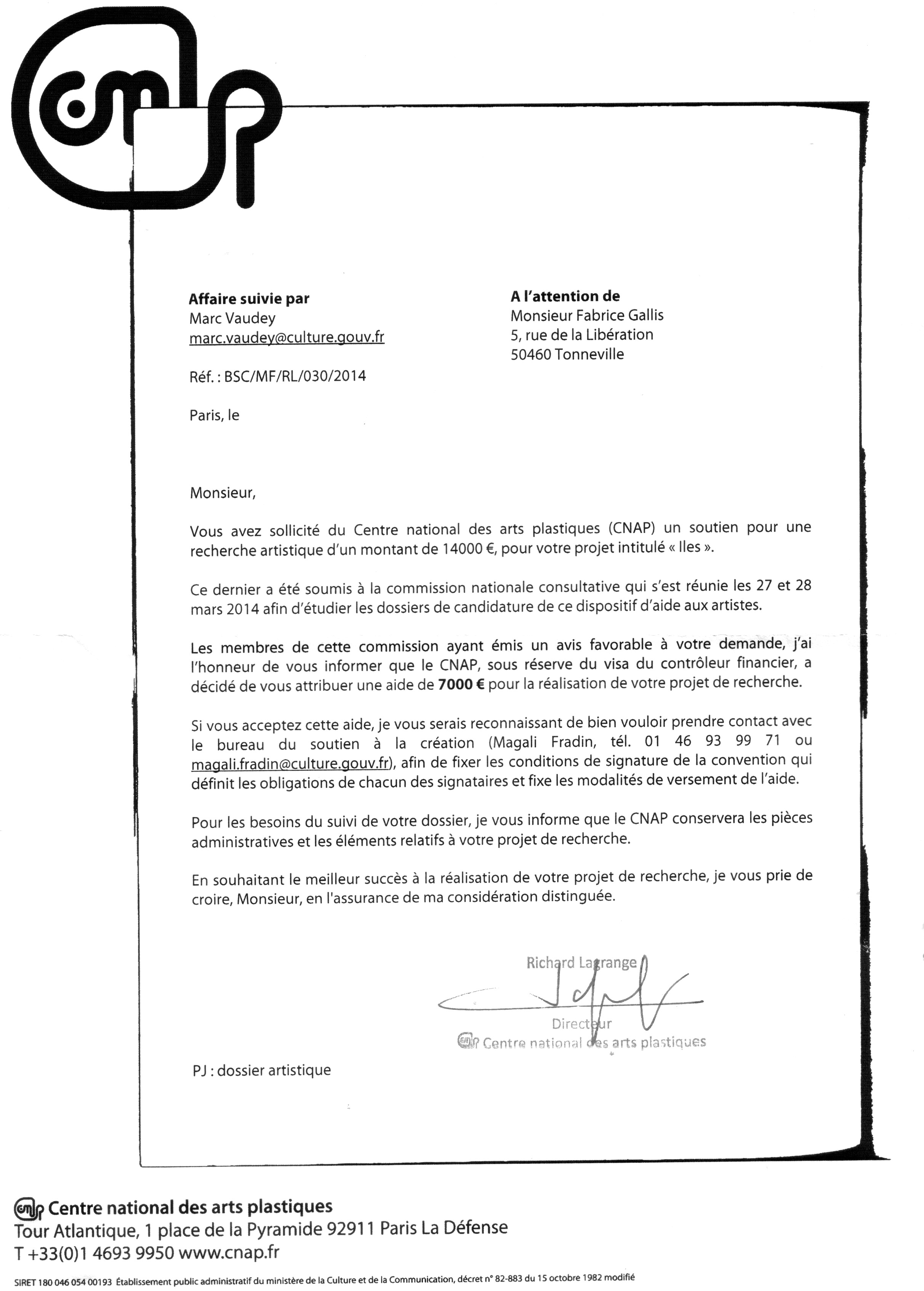 En terme de subvention, nous venons de recevoir la dotation par le Centre National des Arts Plastiques (CNAP) de 7000 euros.